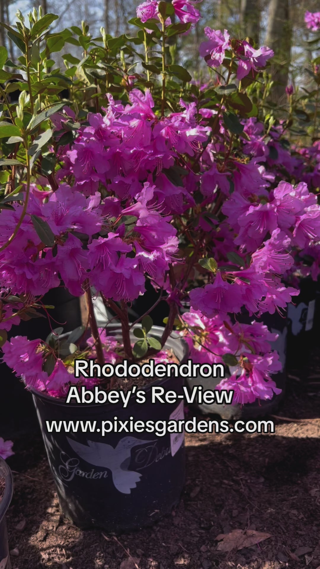 'Abbey’s Re-view' rhododendron will flower in spring and fall, yet in the summer still be attractive with deep green, rich foliage. A very old fashioned looking flower that looks like a heritage azalea blossom. Covered in flowers, the bright lavender pink blossoms really stand out over the darker leaves. 'Abbey’s Re-view' is a great pick for a partial shade privacy hedge, foundation or as a stand out shrub in a landscape design. A farm favorite.