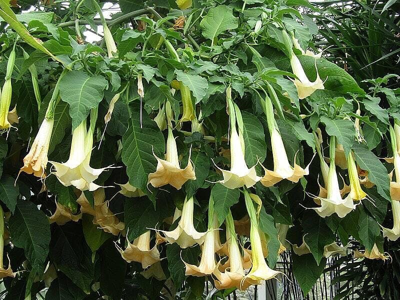 - Angel’s Trumpets are evergreen with multiple branching trunks and typically grow under 26 feet tall.