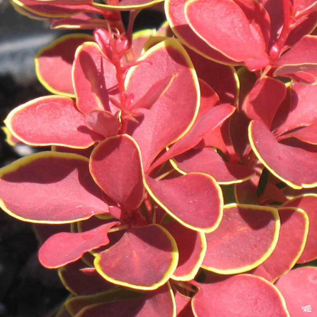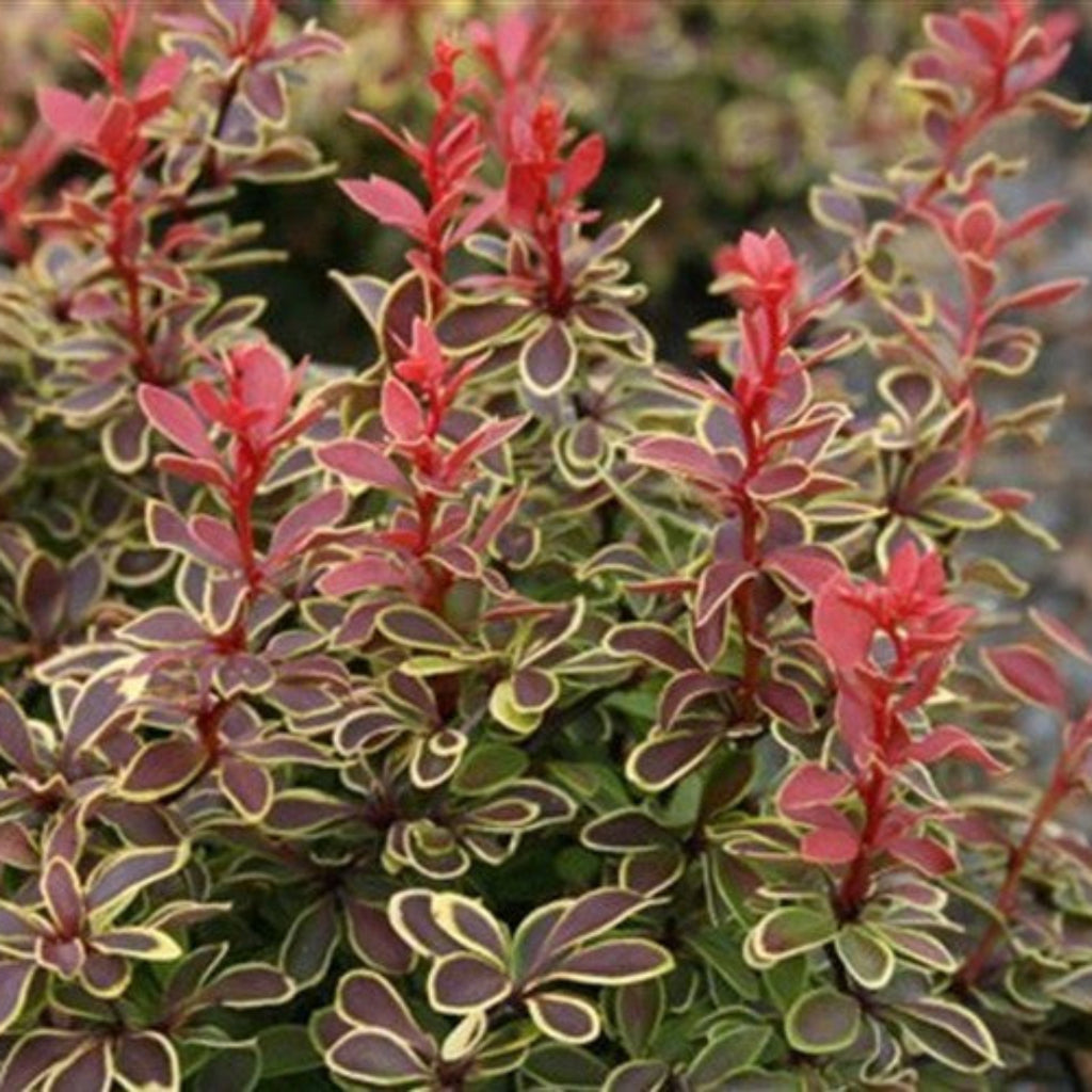 Admiration Barberry is a stunning dwarf ornamental shrub known for its vibrant foliage. The deep red leaves are elegantly edged with bright golden-yellow margins, creating a bold, eye-catching display all season long. This low-maintenance, deer-resistant shrub is ideal for borders, foundation plantings, rock gardens, and containers.