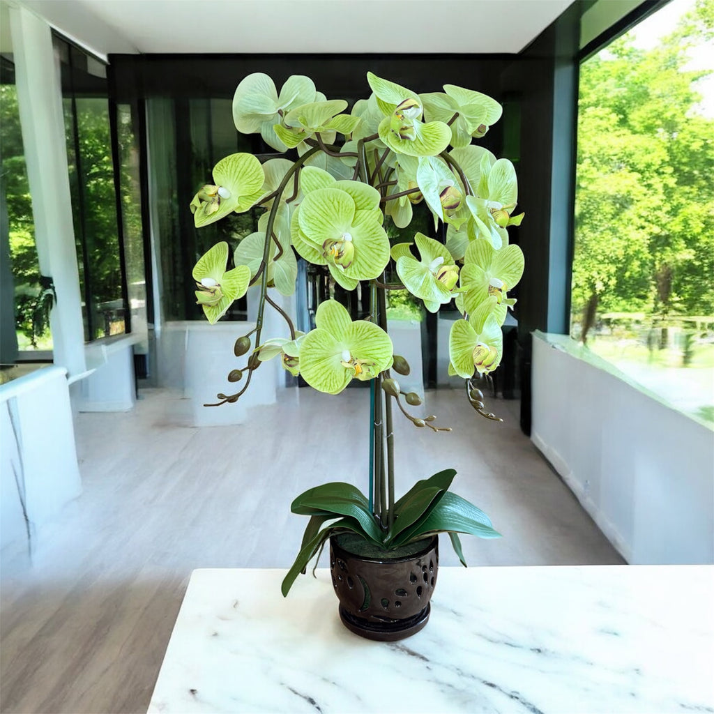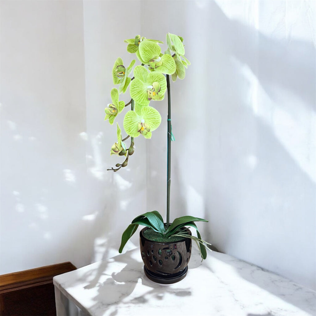 Elegant Green Orchid in Black Ceramic Pot