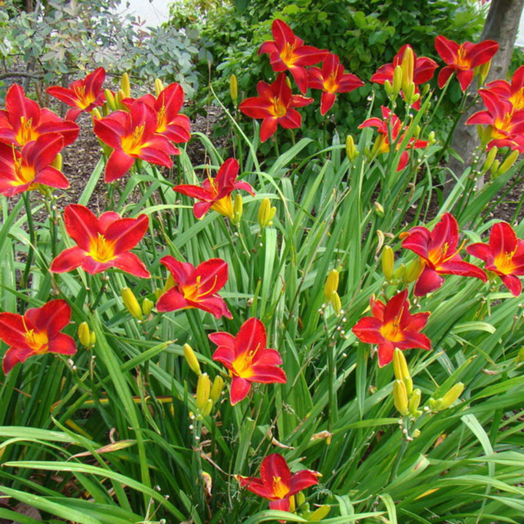 'Autumn Red' is a hardy, low-maintenance perennial that produces stunning deep red, trumpet-shaped flowers with a golden throat. Blooming from mid to late summer, it brings a bold splash of color to borders and beds.