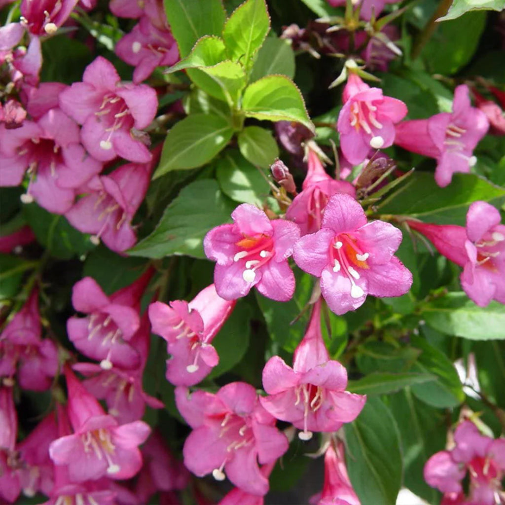'Tango' Weigela is a striking, compact deciduous shrub known for its dark burgundy foliage and bright pink trumpet-shaped flowers. Blooming in late spring with occasional summer reblooms, this variety is excellent for borders, foundation plantings, or as an accent in mixed beds. It’s low-maintenance, deer-resistant, and a magnet for pollinators.